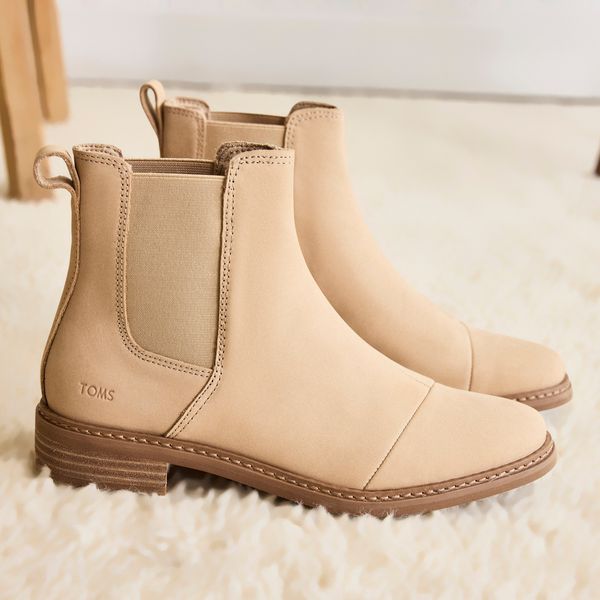 The Chelsea boot that gives back. With a classic silhouette, beige Nubuck leather uppers and CloudBound™ insoles, the Charlie ankle boot brings a classic and comfortable look to any outfit—from slacks and jeans to skirts and dresses.Nubuck leather uppers. TOMS leather products support responsible manufacturing via the Leather Working Group.