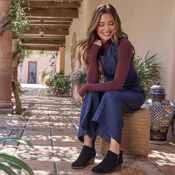 You love wearing the Goldie wedge ankle bootie on repeat! With a just-right heel height, sleek silhouette, and stylish details, this leather-wrapped wedge with a luxe suede upper goes with anything in your closet.Suede uppers. TOMS leather products support responsible manufacturing via the Leather Working Group.