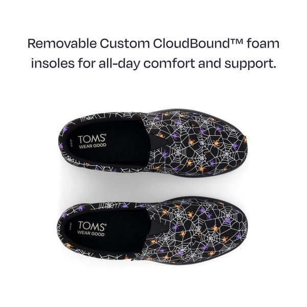 Oh-so-spooky Alpargatas. Perfect for Halloween, these espadrilles feature a classic TOMS silhouette and an unexpected spider print that glows in the dark. Fitted with elastic gore and cushy CloudBound™ insoles for easy entry and long-lasting comfort.Spider-print glow-in-the-dark uppers.
