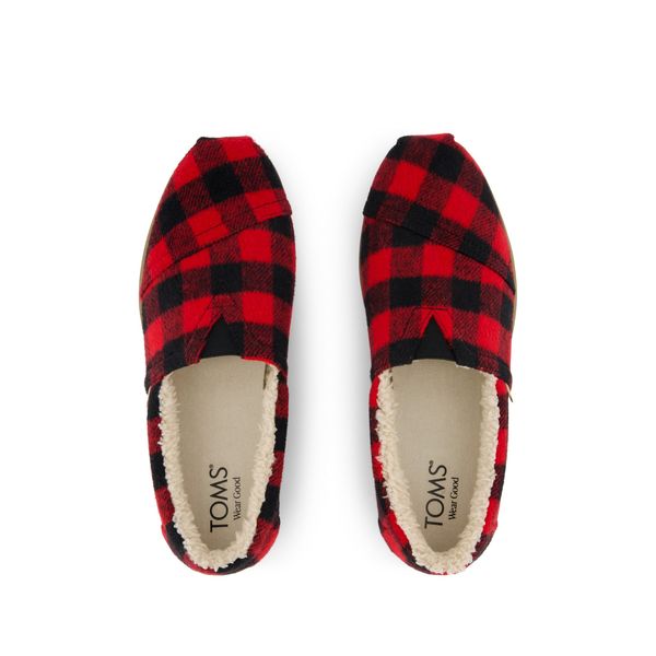 Buffalo Plaid Red Faux Shearling, 10022931TOMS run true to size and are available in medium width only. We recommend ordering the size you normally wear. If you are typically in between sizes, we recommend going with the smaller one since TOMS will stretch slightly as you break them in.