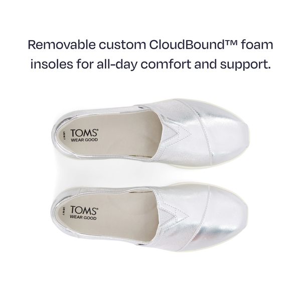 The Alpargata Plus—the most comfortable shoe we’ve ever made, featuring a roomy fit, metallic leather uppers and custom CloudBound™ insoles that feel light and airy on your feet. See the world in the shoe designed to leave an impact.Leather uppers. TOMS leather products support responsible manufacturing via the Leather Working Group.