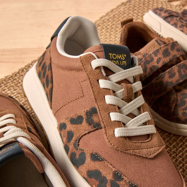 Womens TRVL LITE Retro Runner Sneaker Water Repellent Brown Sugar Leopard Print Suede
