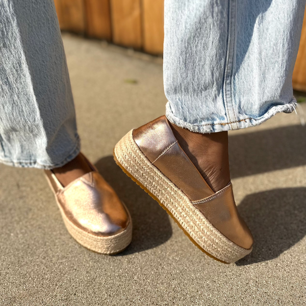 Espadrilles, up a notch. The Valencia platform slip-on shoe stands tall on a rope-wrapped platform with metallic leather uppers to add shine to all of your favorite looks. Cushy CloudBound™ insoles provide support, breathability and comfort on the go.Metallic Nappa leather upper. TOMS leather products support responsible manufacturing via the Leather Working Group.