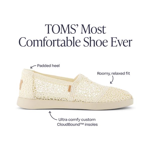 The Alpargata Plus—the most comfortable shoe we’ve ever made, featuring a roomy fit, natural crochet uppers and custom CloudBound™ insoles that feel light and airy on your feet. See the world in the shoe designed to leave an impact.Crocheted textile uppers.