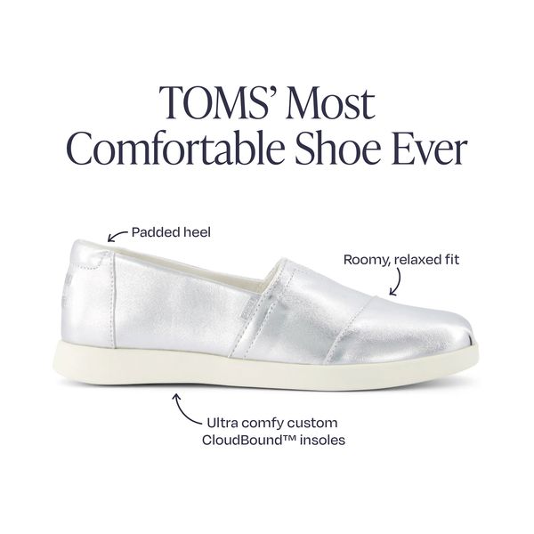 The Alpargata Plus—the most comfortable shoe we’ve ever made, featuring a roomy fit, metallic leather uppers and custom CloudBound™ insoles that feel light and airy on your feet. See the world in the shoe designed to leave an impact.Leather uppers. TOMS leather products support responsible manufacturing via the Leather Working Group.